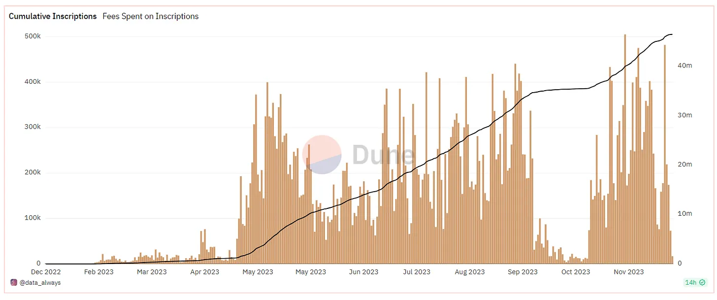 Up to now, in nearly a year, over 46 million inscriptions have been minted, and the number continues to increase. So far, users have spent over $105 million worth of fees to engrave their data.