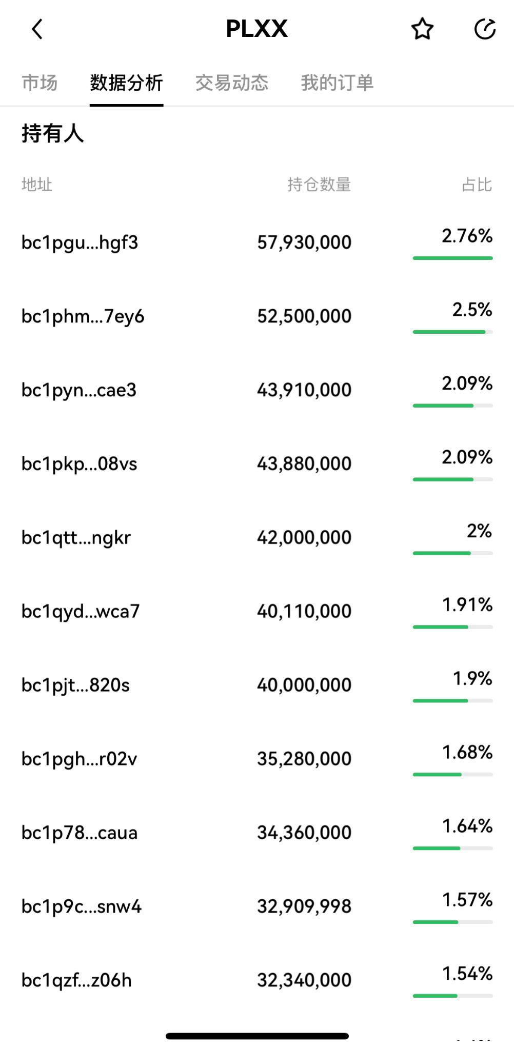 Data analysis of the holders shows that the top 10 holders occupy 20.14% of the total supply. Compared to the total number of users, PLXX inscriptions are relatively dispersed, indicating that PLXX is mainly held by retail investors, essentially in line with the purpose of "decentralization."