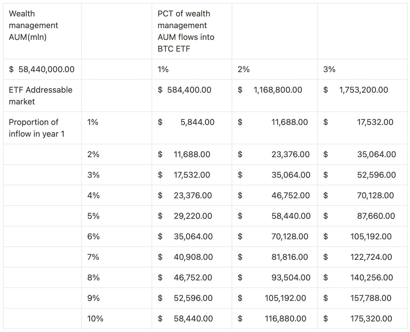 By using a very conservative method similar to gold and estimating the inflow of funds into BTC in the first year after the approval of the BTC spot ETF, using 1% of the $58.44 trillion in wealth management AUM flowing into BTC, it is estimated that the first year's inflow of funds will be around $5.4 billion to $29 billion.