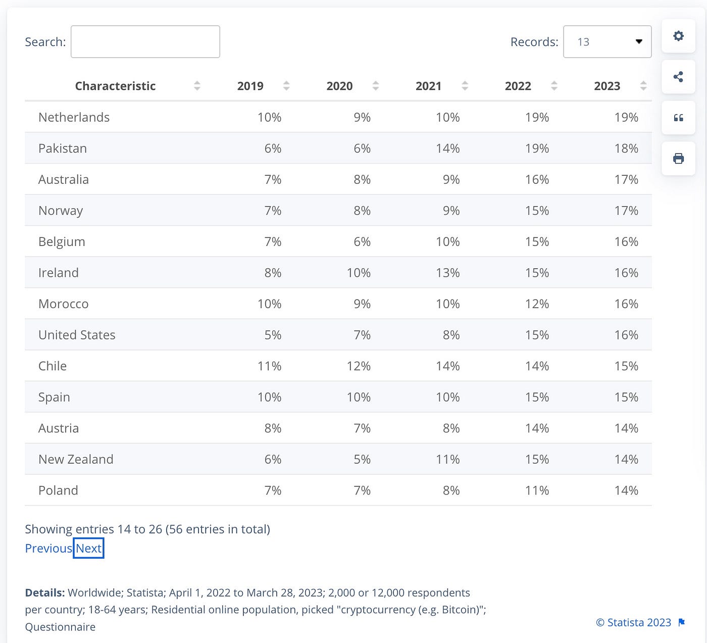 If we consider the additional adoption from the retail side, the percentage of BTC holdings in the U.S. was 5%, 7%, 8%, 15%, 16% in 2019-2023, ranking 21st among all countries. The approval of the BTC spot ETF is likely to continue to increase this percentage. Assuming this percentage increases to 20%, adding 13.2 million retail customers, calculated with an average household income of $120,000, assuming an average holding of $1,000 worth of BTC per person, this would generate an additional demand of $13 billion.
