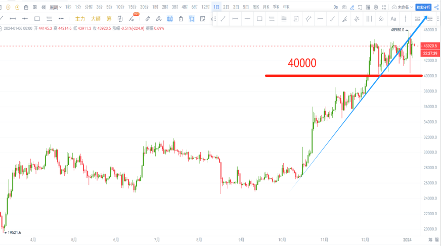 1. Daily chart: After breaking through the $40,000 level, the price has remained volatile. If the subsequent pullback does not break through, there will continue to be an upward trend.