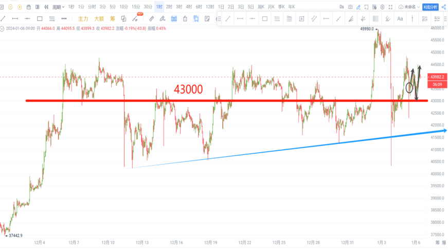 1. 1-hour chart: After testing the $43,000 level in the short term, there was a rebound. If the subsequent pullback does not break this support, there will continue to be an upward trend.