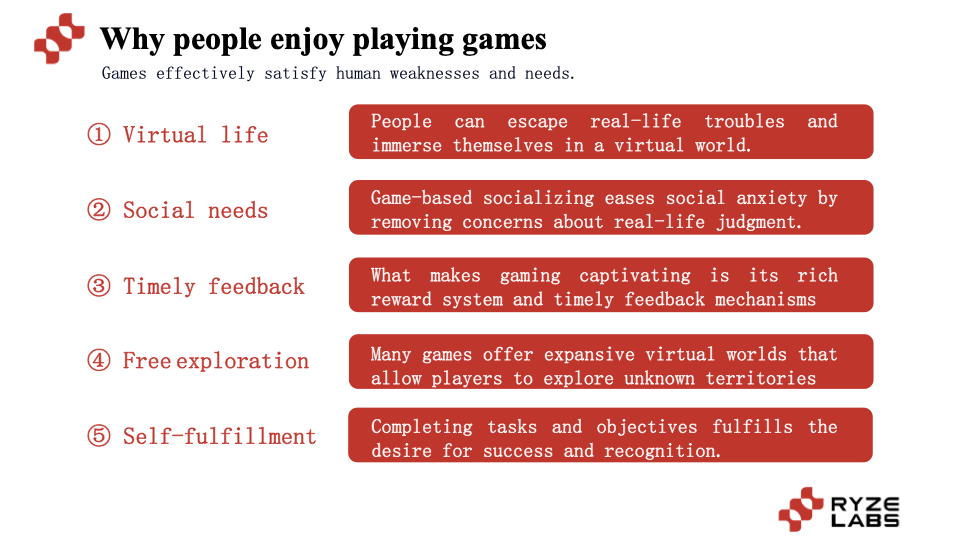 According to Statista's data, the number of global gamers has exceeded 2.5 billion, approaching 3 billion. So how can games attract over one-third of the global population to participate? The core reason can be summarized as satisfying various human needs and weaknesses: