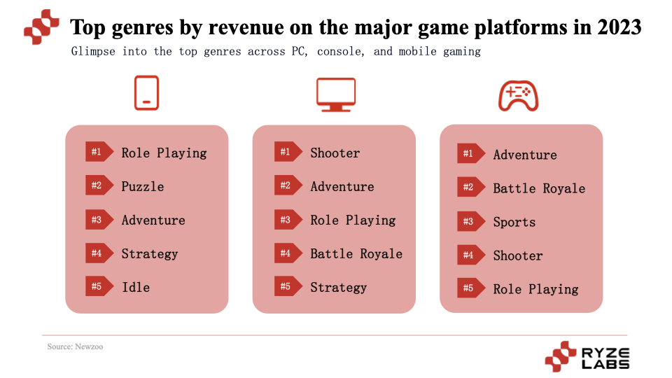 According to Newzoo's data, role-playing and adventure games perform well on PC, mobile, and console platforms, ranking in the top five. Additionally, shooting and battle royale games are very popular on PC and console platforms. The mobile platform is slightly different, with puzzle and idle games also being popular among users.