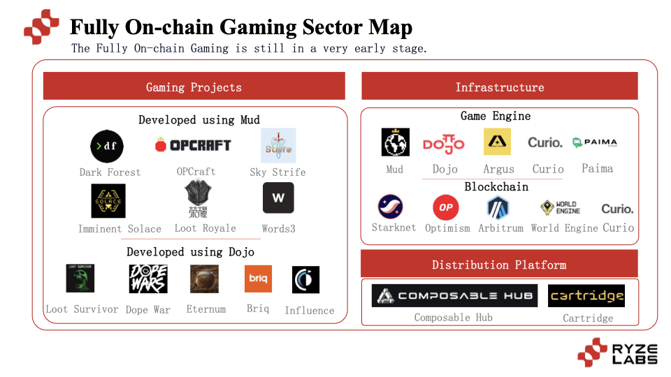 The entire full-chain game industry is currently in a very early stage of development, both in terms of game projects and related infrastructure. In the industrial map of the full-chain game field, it can be roughly divided into four categories: full-chain game projects, full-chain game engines, full-chain game chains, and full-chain game distribution platforms.