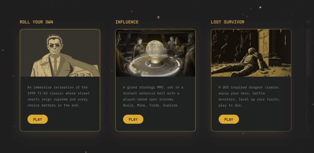 Cartridge is a full-chain game aggregator in the Starkware ecosystem, aiming to create a Web3 Steam. It currently aggregates 5 games from the Starknet ecosystem: Dope Wars-Roll Your Own, Influence, Loot Survivor, Briq, and Frens Land.