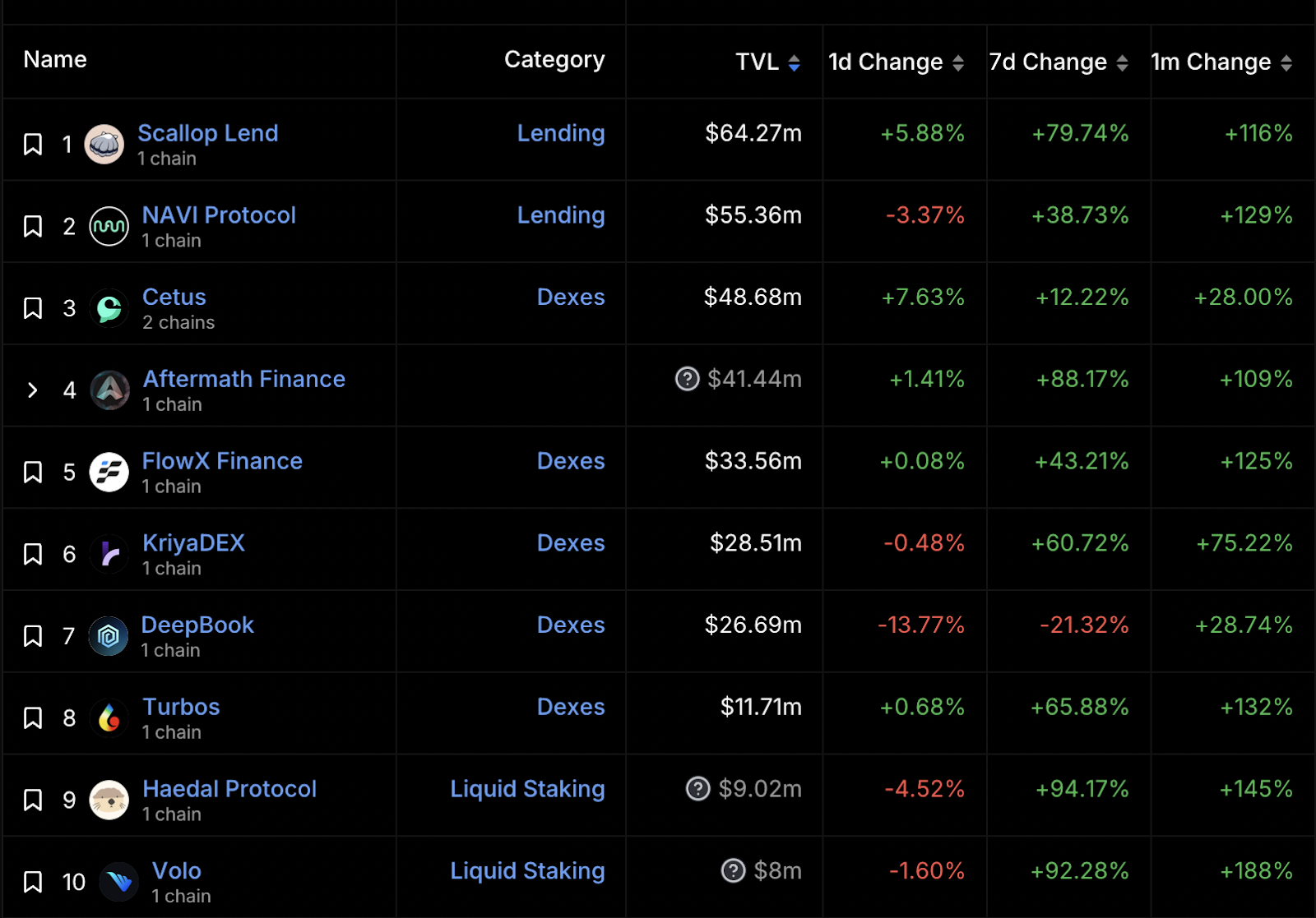According to DefiLama, the top 10 projects by TVL, the largest proportion is in the Dex track; Scallop and NAVI Protocol in the Lending track occupy the top 2 positions, accounting for one-third of SUI ecosystem TVL.