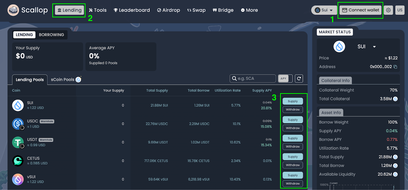 Scallop is the currency market of the Sui ecosystem. By emphasizing institutional-grade quality, enhanced composability, and strong security, Scallop is committed to building a dynamic currency market, providing high-interest rate lending, low-cost lending, AMM, and asset management tools on a unified platform, and providing SDKs for professional traders.