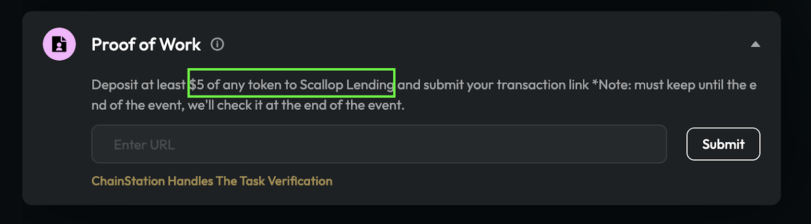 Currently, Scallop is still running activities on the Web3 task platform. Users who interact with Scallop's lending for more than 5U meet the activity conditions. After completing the interaction, you can submit the information, and even win 10 SUI. https://taskon.xyz/campaign/detail/31297