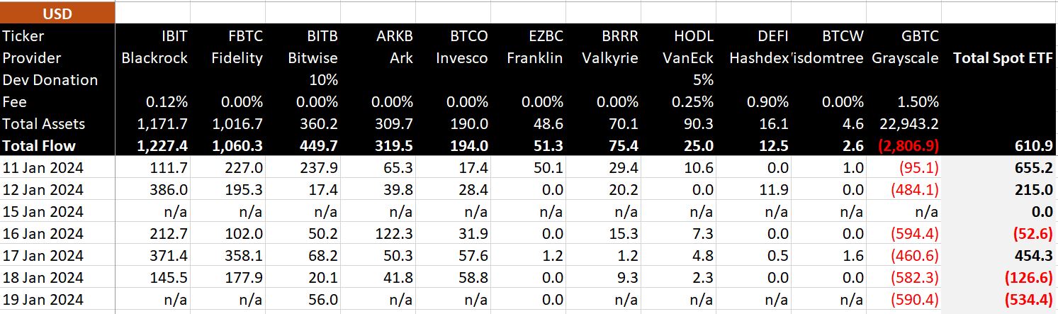 According to data from BitMEX Research shown, in the six trading days leading up to last Friday after the transformation of GBTC into a Bitcoin spot ETF, the total outflow of GBTC reached as high as $2.8 billion, with outflows of $95.1 million on the first day, $484.1 million on the second day, $594.4 million on the third day, $460.6 million on the fourth day, $582.3 million on the fifth day, and $590.4 million on the sixth day.