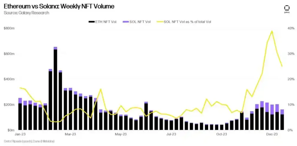 - As of January 8, 2024, Solana's weekly NFT trading volume accounted for 25% of the total NFT trading volume.