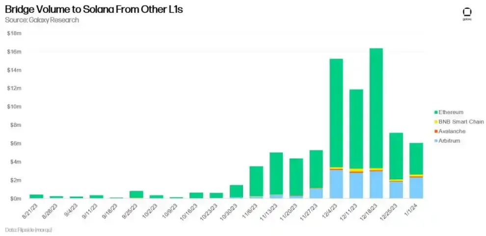 In 2024, the trading volume of Solana NFT will continue to compete with that of Ethereum's NFT. Since December 1, 2023, a total of $50.5 million has been bridged from Avalanche, Binance Smart Chain, Arbitrum, and Ethereum to Solana. Although the influx of new capital into Solana may be driven by airdrops and yields provided by Solana's decentralized finance (DeFi) applications, if the incentive measures change, these applications can immediately exit the ecosystem. However, it is expected that some of the new capital will flow into Solana NFT. Based on the speed of Ethereum NFT recovery and the amount of new capital flowing into Solana as of December 2023, Solana NFT trading volume may account for 30%-50% of the total NFT trading volume in 2024.