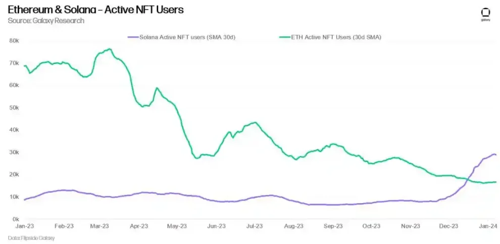 By observing the on-chain activities of wallets that buy, sell, or mint NFTs on a daily basis, it is evident that the Ethereum NFT market lacks new users. In 2023, the number of active users in the Ethereum NFT market decreased by 73%, while during the same period, the number of active users in Solana's NFT market increased by over 200%. The number of active NFT users on Solana surged on December 19, 2023, surpassing the number of active NFT users on Ethereum. By applying a 30-day moving average to the number of active NFT users on Ethereum and Solana, it can be seen that Solana now has more daily active NFT users than Ethereum.