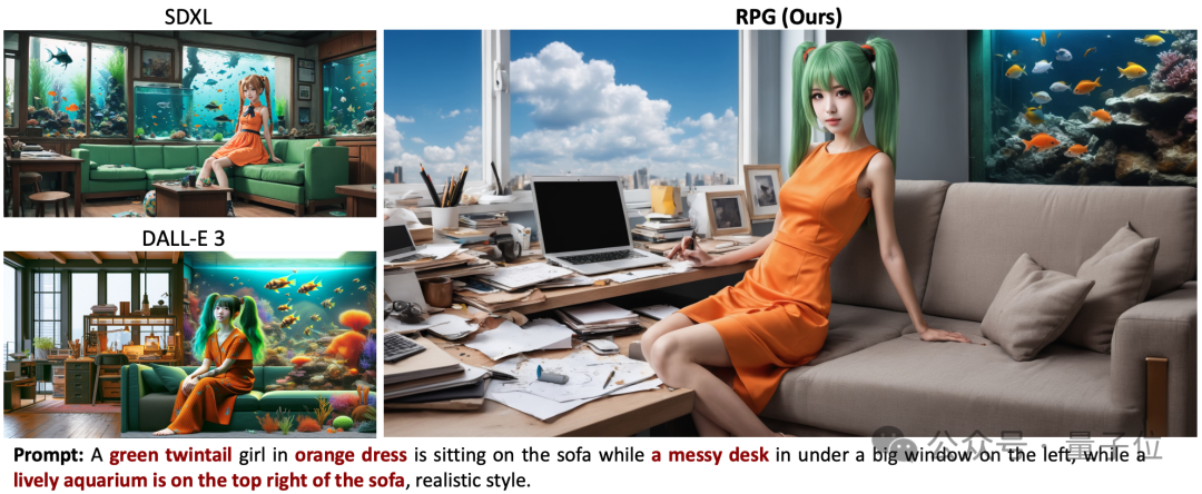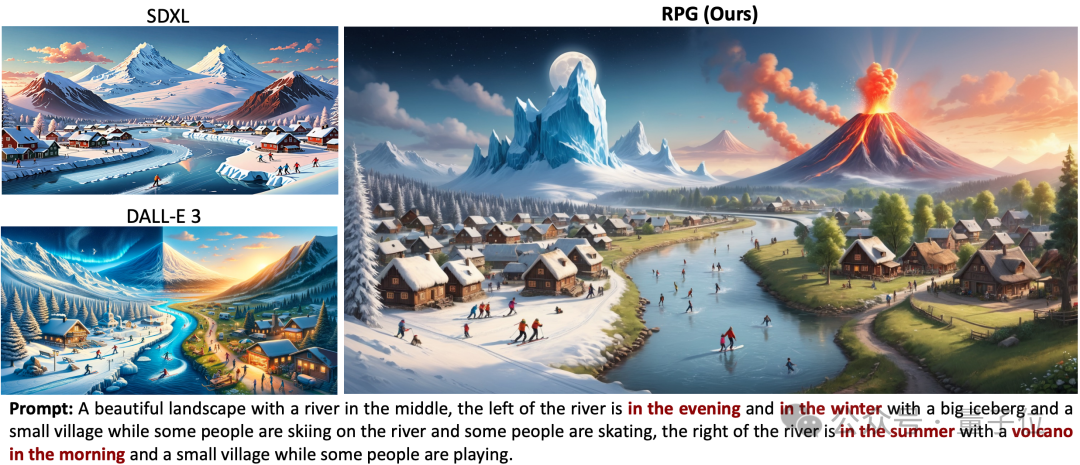 Experimental comparisons show that RPG surpasses other image generation models in dimensions such as color, shape, space, and text accuracy.