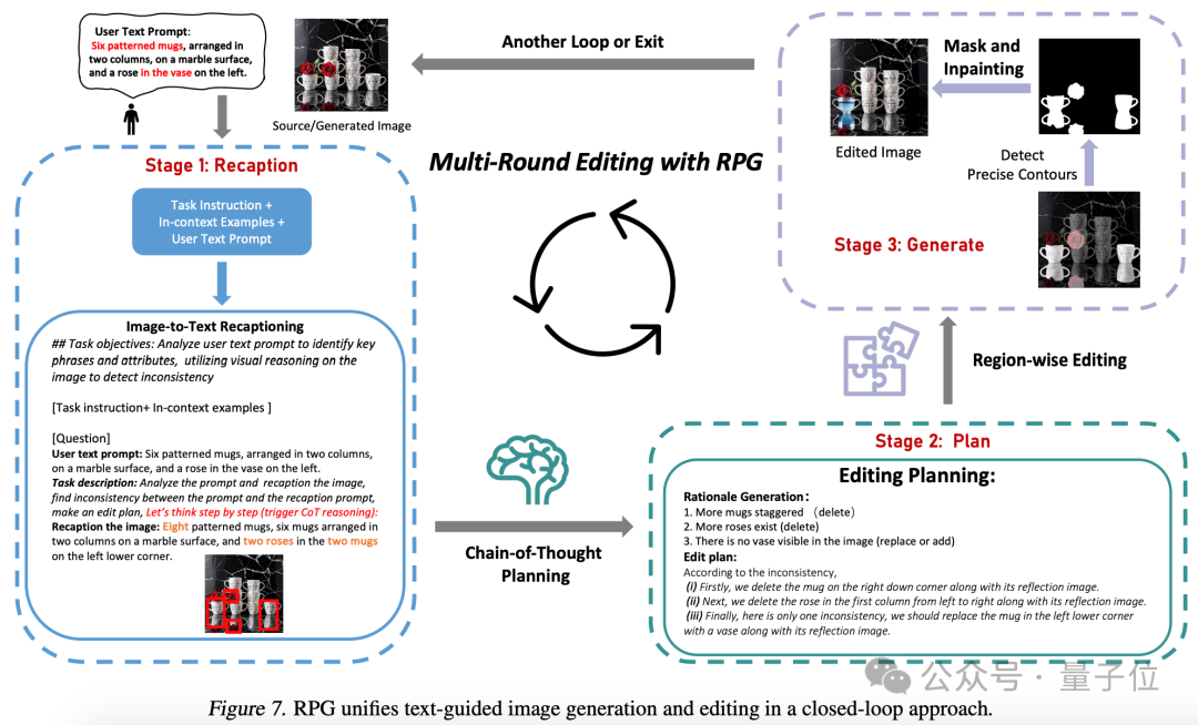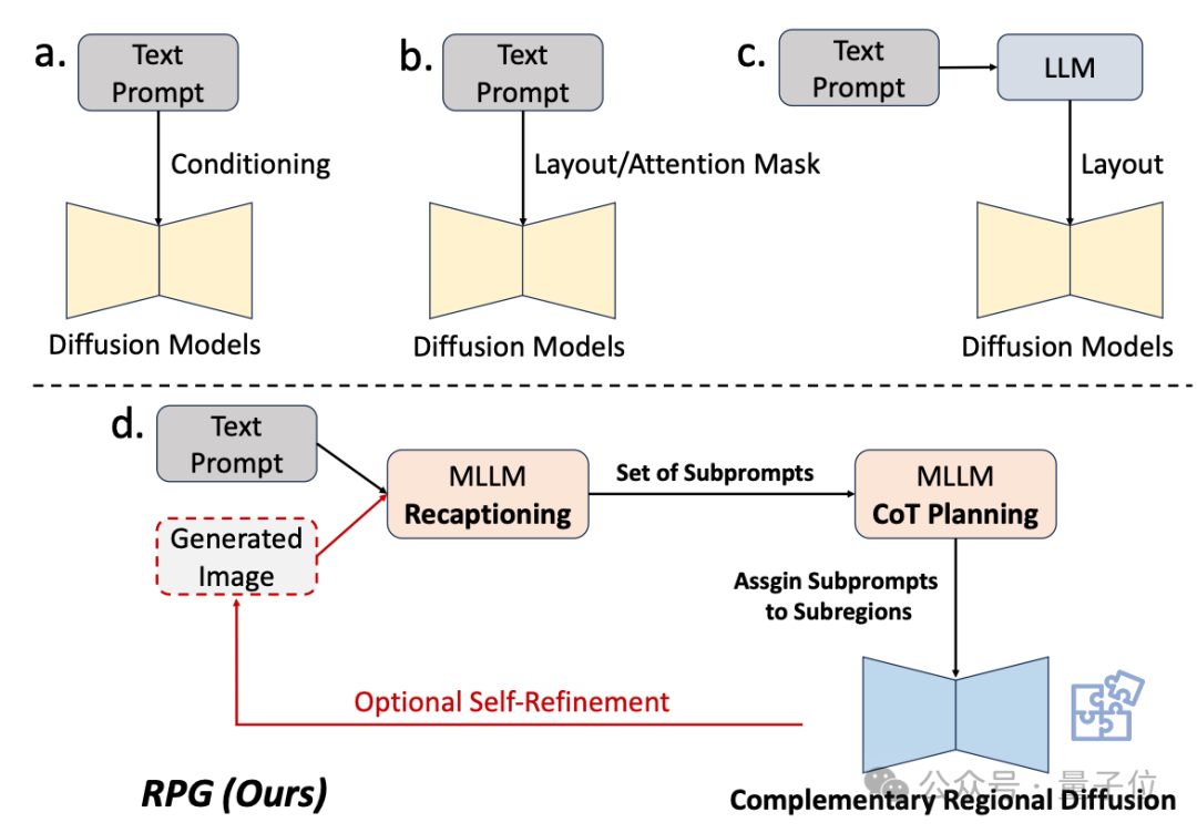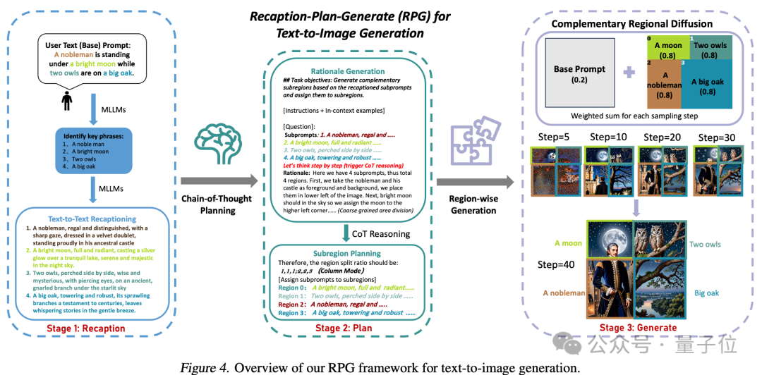 2. Chain-of-Thought Planning: Utilizing the chain-of-thought reasoning ability of multimodal large models to divide the image space into complementary sub-regions and match different sub-prompts to each sub-region, breaking down complex generation tasks into simpler ones.