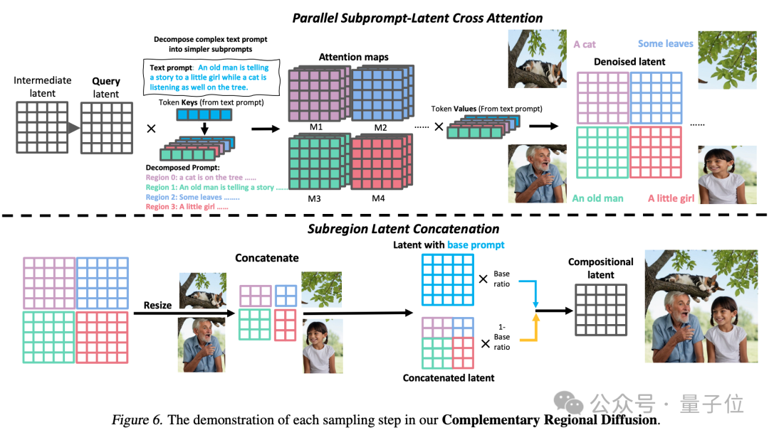 3. Complementary Regional Diffusion: After dividing the space, non-overlapping regions generate images based on their respective sub-prompts, which are then combined.