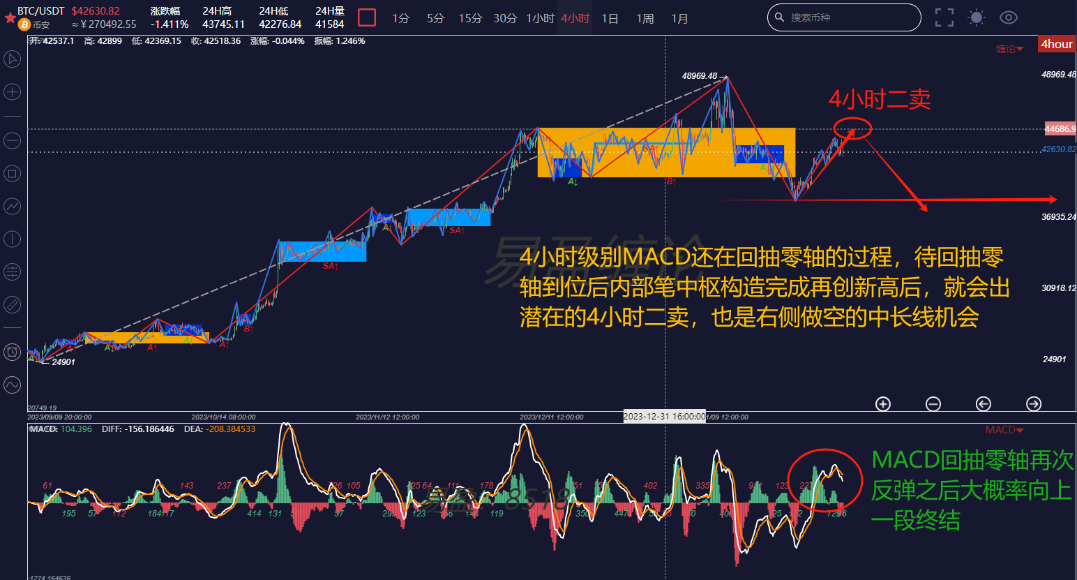 Combined with the observation of the 4-hour chart, the 4-hour MACD is still high above the zero axis. After waiting for the pullback to the zero axis, there will be another upward rebound, corresponding to the completion of the secondary level pen center structure and the upward departure of the pen. Once the three-stage divergence of the pen center appears, there will probably be a 4-hour sell signal. And to confirm the 4-hour sell signal, at least a secondary level 30-minute sell signal is needed, which means a short opportunity on the right side.