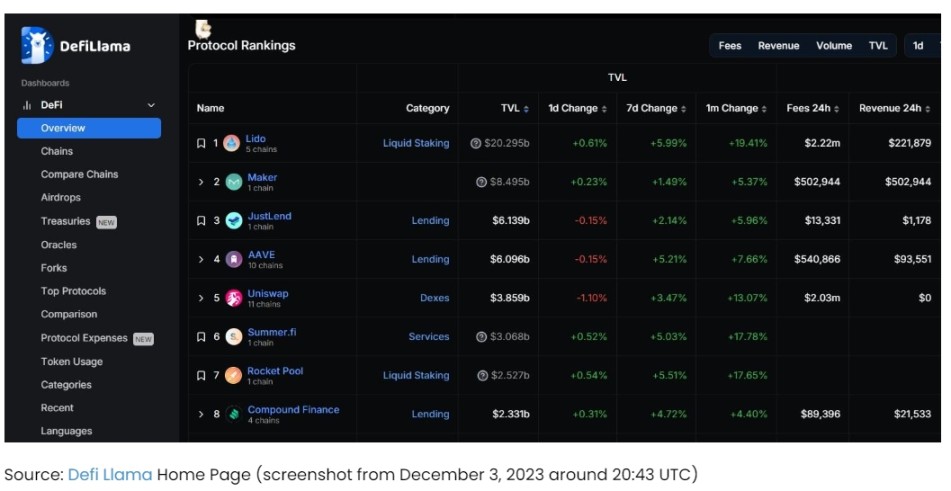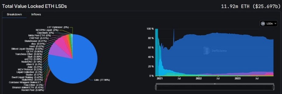 Liquidity staking is a significant category in the DeFi space, with the most successful case being Lido. Lido has now become the largest protocol in the entire cryptocurrency space, with a total locked value (TVL) exceeding 20 billion US dollars, accounting for nearly one-third of all staked Ethereum. Lido earns over 80 million US dollars in fees annually.