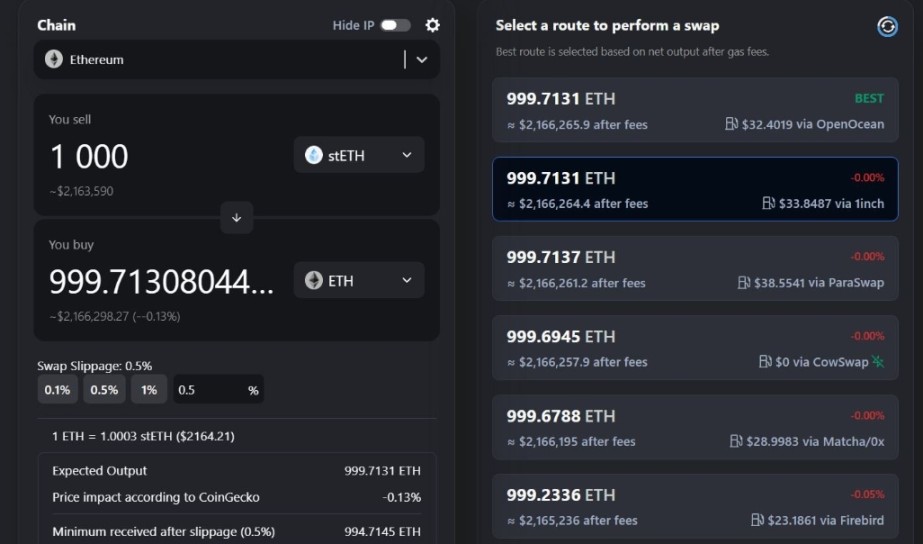 Selling on the open market: Typically, users need to unstake their ETH through Lido, depending on Ethereum's exit queue, which may require waiting for several days to weeks. If users do not want to wait, they can sell stETH on the open market. Selling 1000 stETH (over 2 million US dollars) will result in approximately a 10-15bp slippage.