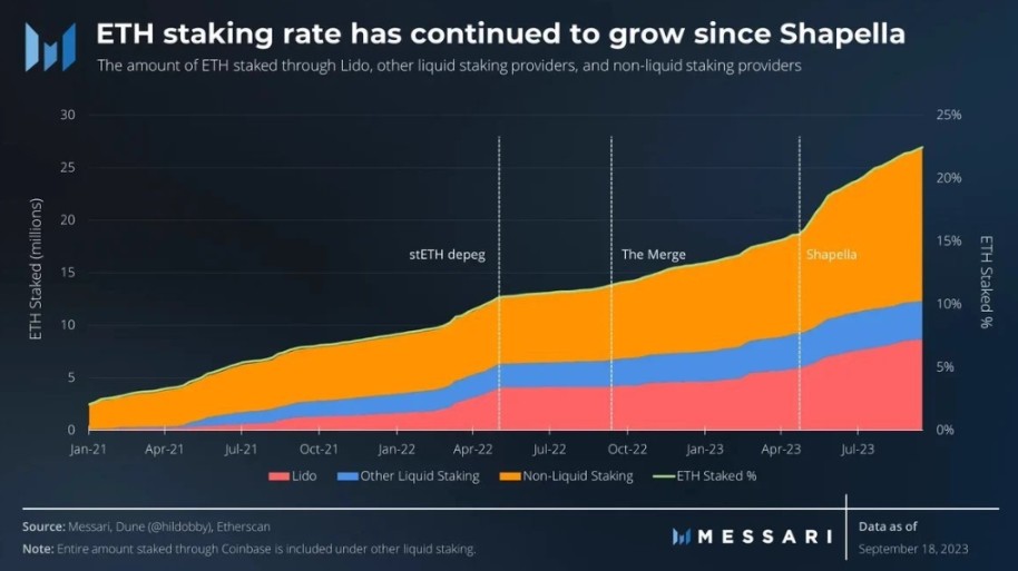 These network effects solidify Lido's dominant position, holding nearly one-third of the total staked ETH and steadily increasing its share over the past 2-3 years. As the proportion of staked ETH steadily increases, Lido continues to benefit. In fact, Lido's dominance is so significant that many are calling for an examination of its systemic importance on Ethereum, including implementing Lido + stETH dual-token governance to ensure alignment between Lido DAO and Ethereum/stETH holders.