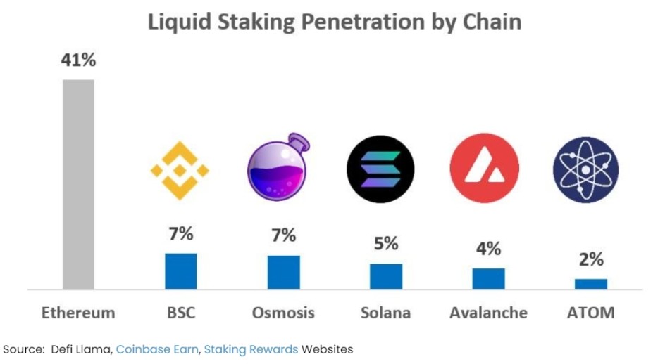 There is a significant difference in the penetration rate of liquidity staking by ecosystem. Ethereum is currently the most mature ecosystem, accounting for 41%, while most other ecosystems are in the range of 2-7%.
