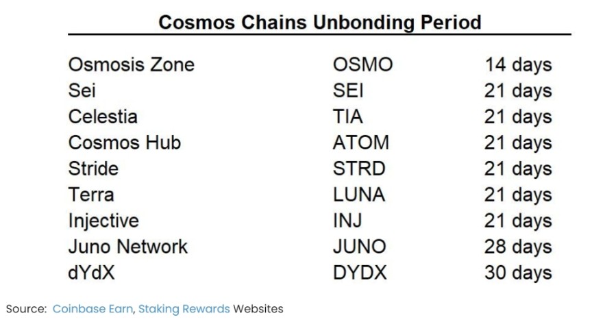 Like other PoS blockchains, Cosmos chains also have a unlocking period for staked tokens. The minimum is 14 days (Osmosis), and the maximum is 30 days (dYdX). The unlocking period for most Cosmos chains is 21 days. When assets are staked and securing each Cosmos blockchain, these assets cannot be used in DeFi (lending, providing liquidity, hedging yields), requiring users to wait for a long time if they choose to sell their assets.