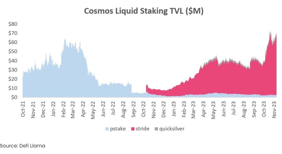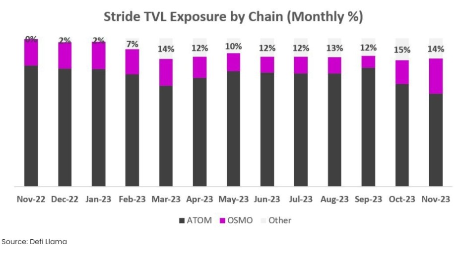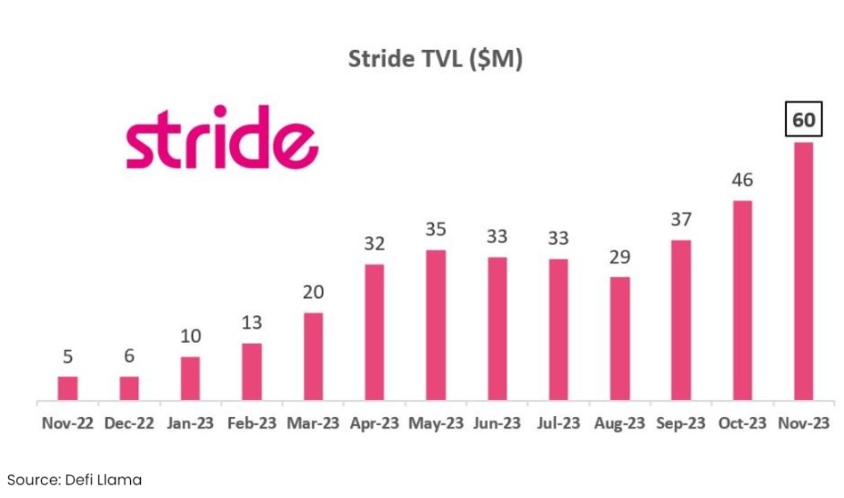 The Stride protocol was launched in September 2022 and has grown to over $60 million in total value locked (TVL) in the past year, supporting all major Cosmos chains/tokens including ATOM, OSMO, INJ, and JUNO, and is soon to support Celestia and dYdX.