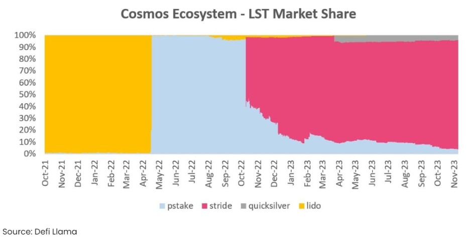 Cosmos has three major liquidity staking participants—Stride, pStake, and Quicksilver.