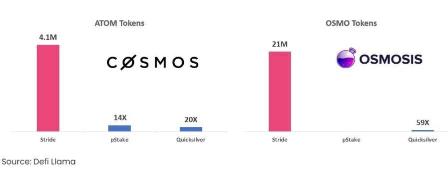 Stride holds 14-20 times more ATOM than its two competitors (holding over 85% of the staked ATOM), and 59 times more OSMO than Quicksilver (holding over 95% of the staked OSMO). This leadership position is very prominent, and we believe this advantage will be maintained over time.