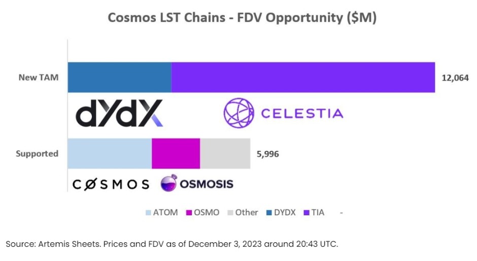 Celestia ($8-9 billion FDV): Celestia is part of the modular expansion roadmap for Ethereum and is one of the leading data availability (DA) layers. They recently deployed to the mainnet on October 31, 2023. With the growth in usage of Ethereum and its L2, Celestia may see development. Stride has communicated with the Celestia governance to begin supporting LST (called stTIA).