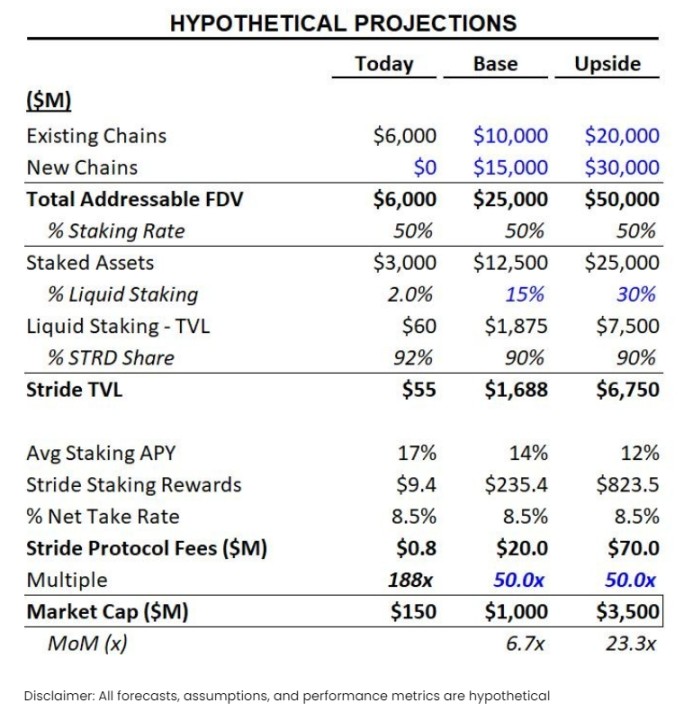 In the long term, dYdX and Celestia provide opportunities for Stride with over $100 billion FDV, compared to the existing supported chains with around $6 billion. We believe that in addition to the ongoing penetration of LST on existing chains (ATOM, OSMO, etc.), these could be strong additional drivers for Stride's growth.