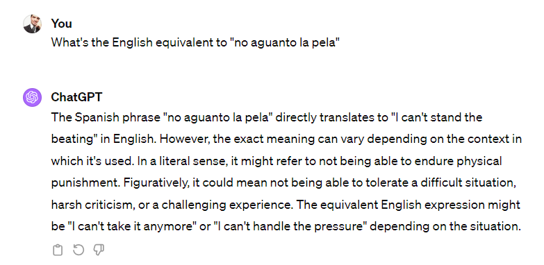 ChatGPT was quick to offer a literal translation along with probable meanings related to "I can’t stand the beating." While technically accurate, this lacked the punch of the original slang. It missed the mark on conveying the true intention of the speaker, and even though it inferred the true meaning, it emphasized its uncertainty.