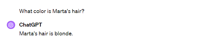 Next, let's evaluate these chatbots’ long-term memory. Can it remember a throwaway detail from a long story and still recall it on demand? To see which chatbot could "hold a thought" better, we threw both models a curveball. Both were fed the complete text of a short book as a prompt. But mixed into this digital tome was the sentence: "Marta is a blonde lady who enjoys reading books about Mixed Martial Arts."