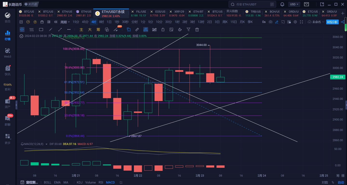 Ethereum market analysis: Yesterday, Ethereum showed a doji trend, and the battle between long and short positions around the key level of 3000 was extremely intense. It failed to break through the high point near 3038 after three consecutive attempts and retraced, showing a trend of three peaks. Various technical indicators also showed a downward trend. If a large bearish candle can be formed today, the trend can be confirmed. Considering the trend of Bitcoin, we need to pay attention to whether the main force will take action on the long side before the halving. Changlu also reminded us yesterday to be cautious about chasing long positions, especially around 3030, and to be aware of the possibility of a bull trap. The breakthrough near 3040 and the support near 2955 are the key levels to watch.