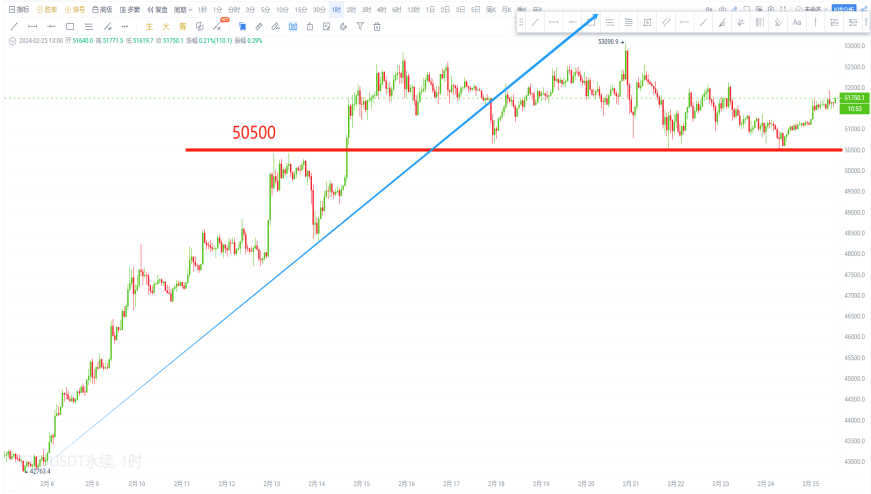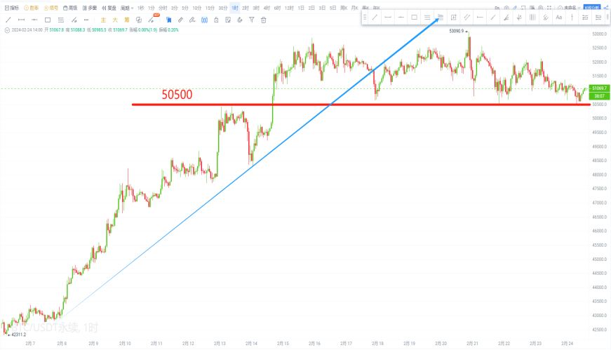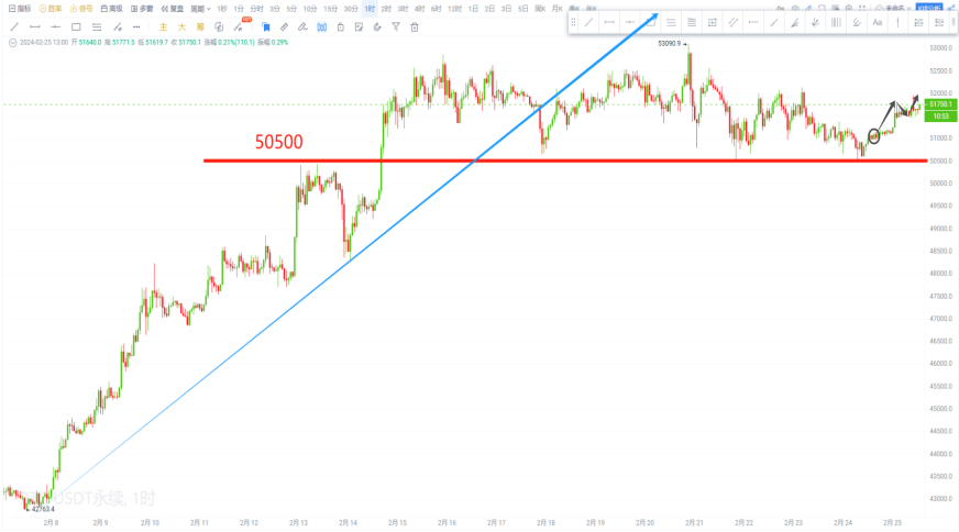 - 1-hour chart: After a short-term breakthrough of the 50500 level, the price maintained fluctuation. If the subsequent pullback does not break this support, there will still be a trend of continued rise.