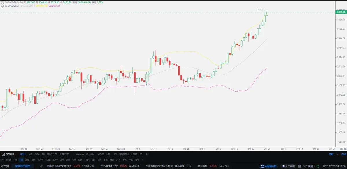 Looking at the overall market conditions, since its listing, Bitcoin has started from the bottom at 30,000, and has risen to the 64,000 position, with almost no significant pullback in between. It can be said that Bitcoin's performance is stronger than Ethereum, which is why Lao Cui hardly analyzes the trend of Bitcoin. Entering Bitcoin requires a large amount of capital, and users who can hold Bitcoin for a long time are also not the target users of Lao Cui. I believe that everyone's understanding is basically stronger than Lao Cui's. The key observation of Bitcoin's later trend is whether it can successfully break through the 70,000 mark. Currently, from the perspective of news, technology, and capital volume, there are signs of this, launching an assault towards higher positions.