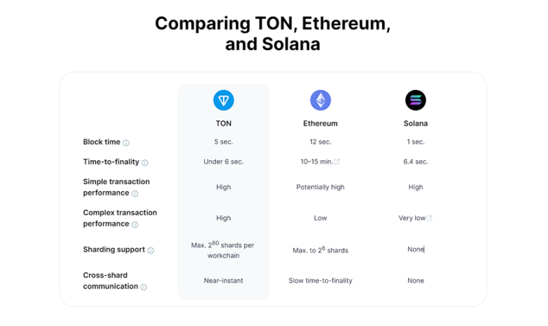 In its official performance comparison with other public chains, the TON chain seems to be able to outperform Ethereum and Solana in all aspects.