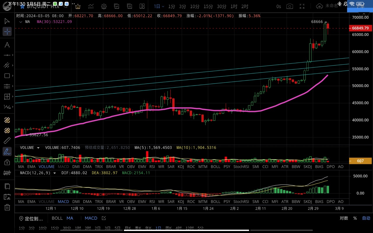 Bitcoin fell several times to near 63,300 yesterday but failed to break through. The market then rose all the way, reaching a high of 68,666 before falling back. Congratulations to friends who followed the low long strategy and gained 5,000 points in profit. Currently, the price is running near 66,480, forming ten consecutive upward candlesticks on the four-hour chart, followed by a ten-cross doji breaking the uptrend, leading to a small waterfall. The MACD bull gradually decreased in volume, and the fast line turned downward with a death cross sign. The price has now reached near the previous high, and the probability of a breakthrough is not high. There is a possibility of forming a bearish divergence structure. In the short term, do not chase after rising prices and wait for a second rebound. If it does not break the previous high, you can try to go short. On the daily chart, the MACD bull gradually increased in volume, and the two lines crossed upward. If it can stand firm at 64,000 this week, there is a high probability of breaking the historical high. Low long positions should continue to hold, and the strategy suggests focusing on buying on dips and selling on highs. Resistance above is at 68,200-69,000, and support below is at 64,000-63,000.