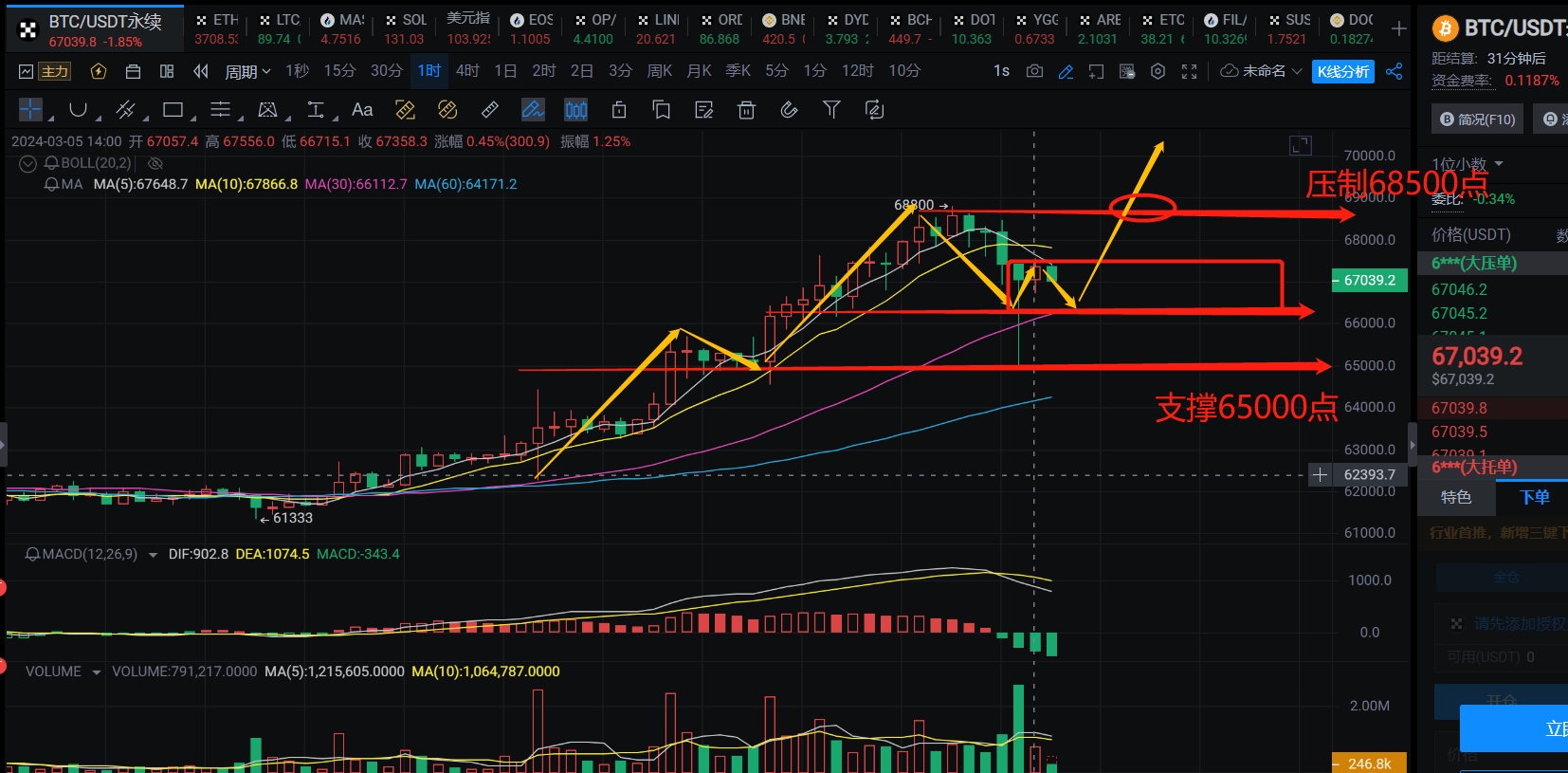 Technical section: The trend market continues to rise, with the overall market breaking through the 68,000 point high for the first time, and Ethereum also running above 3,700 points. In the recent market trend, Lao Jin repeatedly reminded that the upcoming Cancun upgrade hotspot this month and the approval of the ETH-related ETF application will have a decisive positive impact on the market. Therefore, after the current high point of the bull market, the day when the market high point of the overall market is about to break through the historical high is imminent. Currently, the technical form shows that the bull market is strong and the market is likely to continue to rise. The midday market for the overall market dropped to around 65,000 points, and Ethereum dropped to around 3,650 points. After testing the low point in the short term, the market quickly returned to a normal bull trend, proving that these two points have strong downward resistance on the market. Therefore, the direction of the orders remains unchanged, and the main idea is to continue to look for long positions at the low level, combined with the early market's insertion of the low point to maintain the low level.