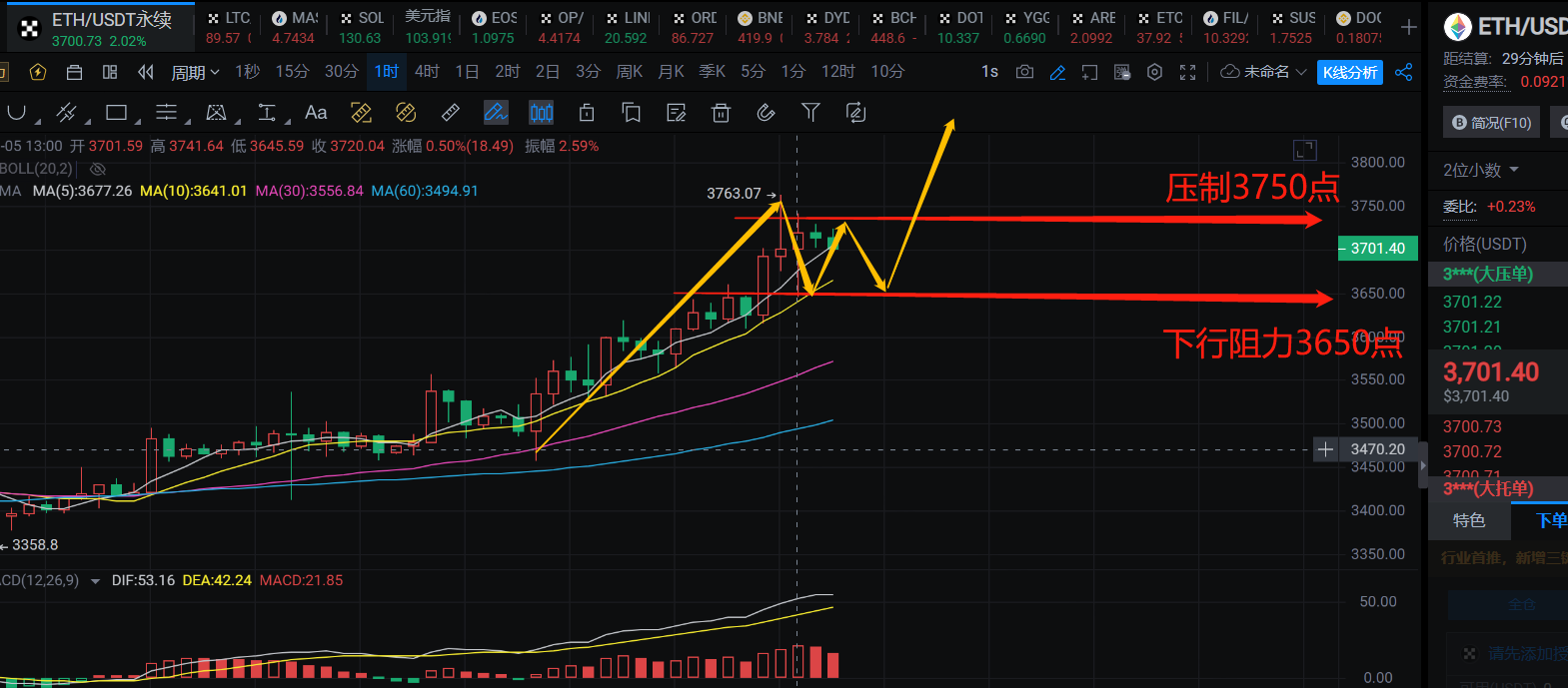 ETH: The short-term support below is at 3,600 points. For retracement, take a low position near 3,650-3,660 points, with risk control at 3,600 points, and a target of 3,800 points.