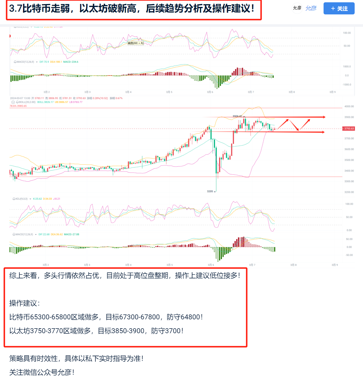 Analysis of the current market situation: the market is currently trading sideways at a high level, and the bullish trend is still in place. A buying opportunity is presented at the lower level, with a long position recommended in the 65300-65800 area for Bitcoin, targeting 67300-67800. For Ethereum, a long position is recommended in the 3750-3770 area, targeting 3850-3900. Currently, Bitcoin has successfully taken profit, and Ethereum has reached the first target. For aggressive traders, holding to see if Ethereum can reach the 3900 level is an option!