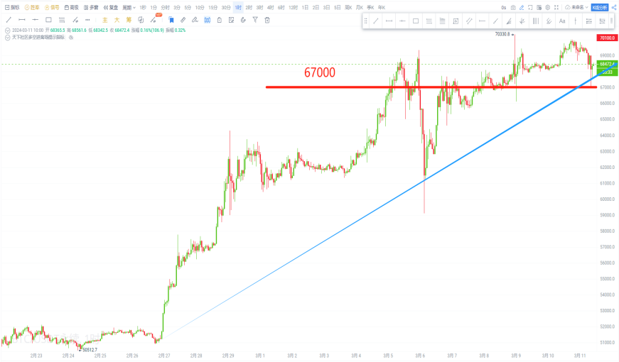 The future trend maintained oscillation after a pullback did not break the 65,600 support, reaching a high of 69,999.