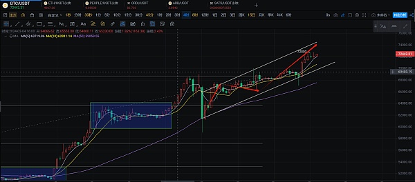 Yesterday, Bitcoin refreshed its historical high, breaking through the 70,000 mark. It was also mentioned in the article that the recent support for Bitcoin has been moving upward, indicating a further upward trend, and the suggestion given was to consider a long position.