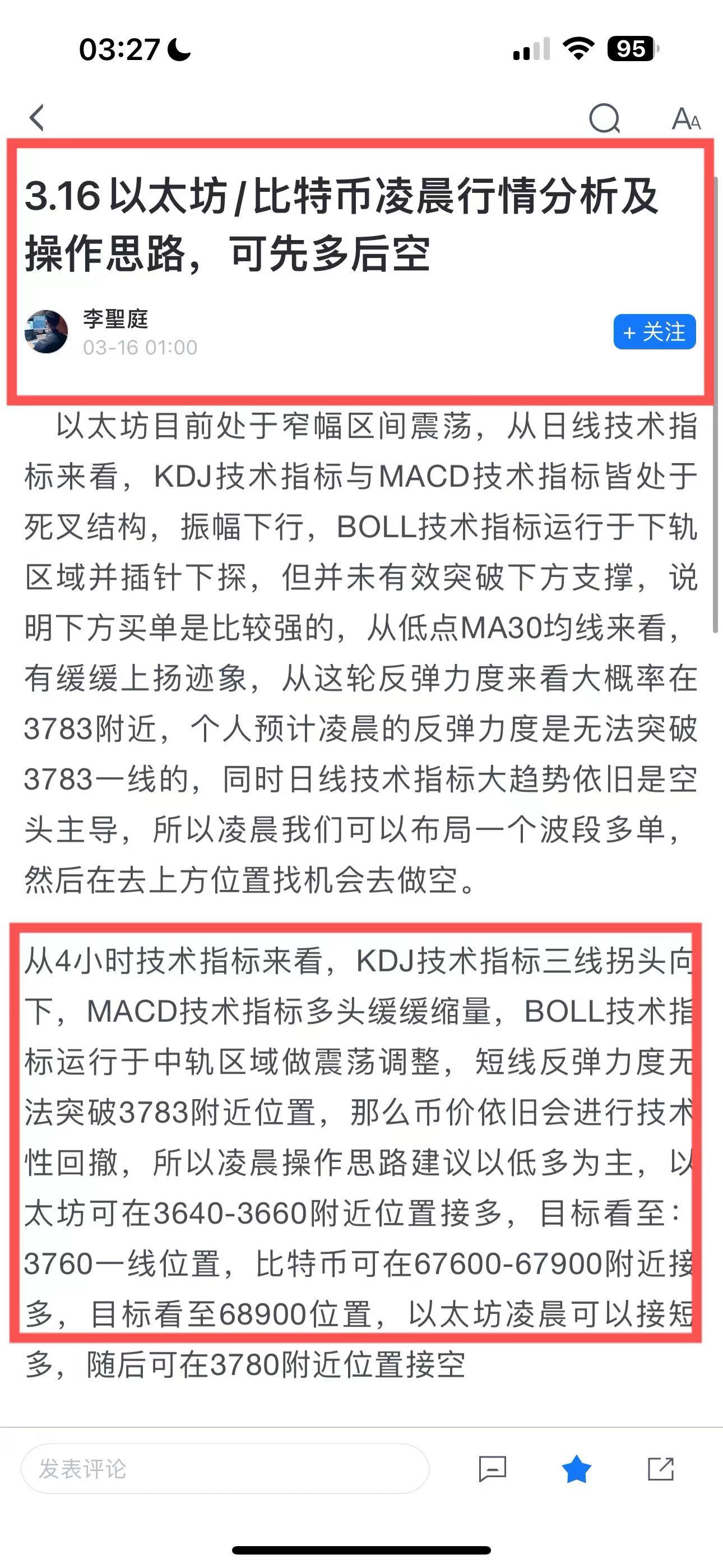 The rebound during the early morning completely conforms to the expected trend and technical indicators. However, the 12-hour technical indicators KDJ and MACD still maintain a dead cross structure. Moreover, this round of market rally has not undergone technical retracement and repair, so there is a high probability of a new round of decline. Therefore, we can consider establishing short positions at high levels in the morning. Short positions can be set up near 3780-3800 for Pionex, with the target set at around 3650. For Bitcoin, short positions can be set up near 67900-68200, with the target set at 67000-66000.