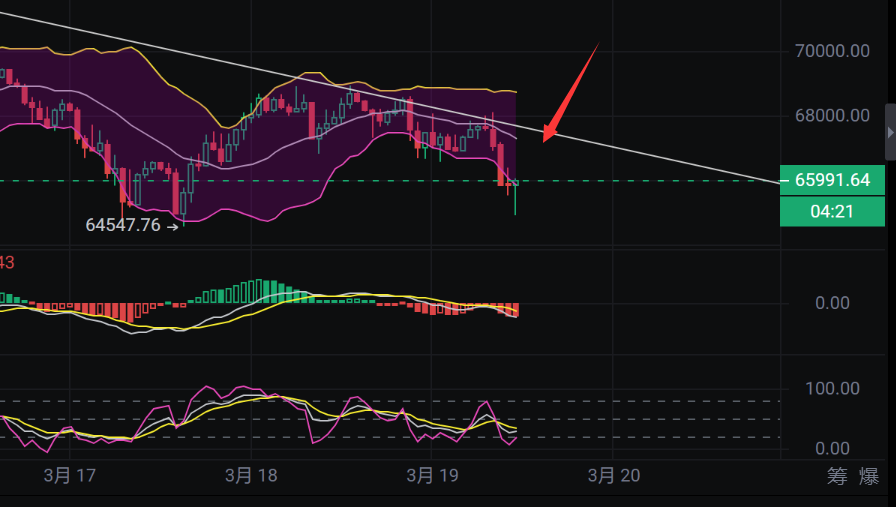 Bitcoin's market is similar to the analysis of the previous day. The market sentiment is extremely greedy, and there is a high pressure above, so the probability of shorting is relatively high. I also suggest shorting above 68000. Today, the coin price is as expected, breaking through the 3000+ space! Congratulations to the friends who profited! Looking at the hourly chart, the Bollinger Bands continue to diverge downwards, MACD negative continues to strengthen, and KDJ diverges downwards; the 4-hour negative has just begun, and Lao Zhang expects a larger downward space in the short term! Suggesting to focus on shorting; pay attention to the points of 66200 and 67100 above; the market changes in an instant, please set good stop-loss and take-profit!