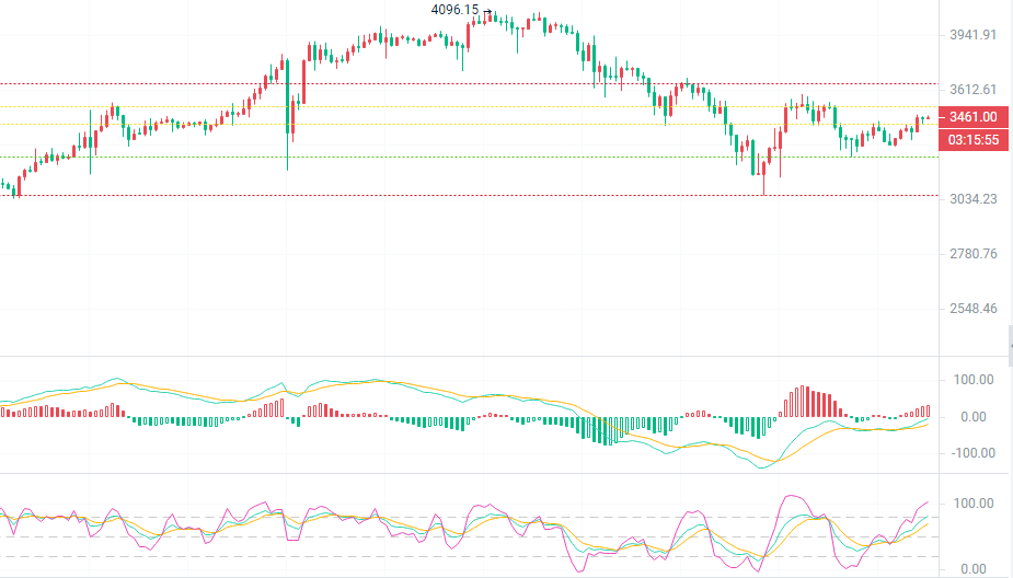 From the perspective of the four-hour ultra-short-term trend, Ethereum may challenge the pressure level of 3520. However, it may be difficult to start a short-term bullish trend because the EMA10 and 15 overlap, increasing the pressure. In terms of MACD, it is necessary to pay attention to the occurrence of large and small volume. If the DEA and DIF alternate downwards, it will mean a trend reversal to bearish. Currently, the DIF and DEA are stretching upwards below the 0 axis. The KDJ is blocked near 3520. The upper resistance level of the Bollinger Bands coincides with the pressure level of the trend indicator EMA at 3520. In summary, the key points have been identified, and prudent investors can wait for a clear trend before operating in the same direction, making it easier to grasp the profit space.