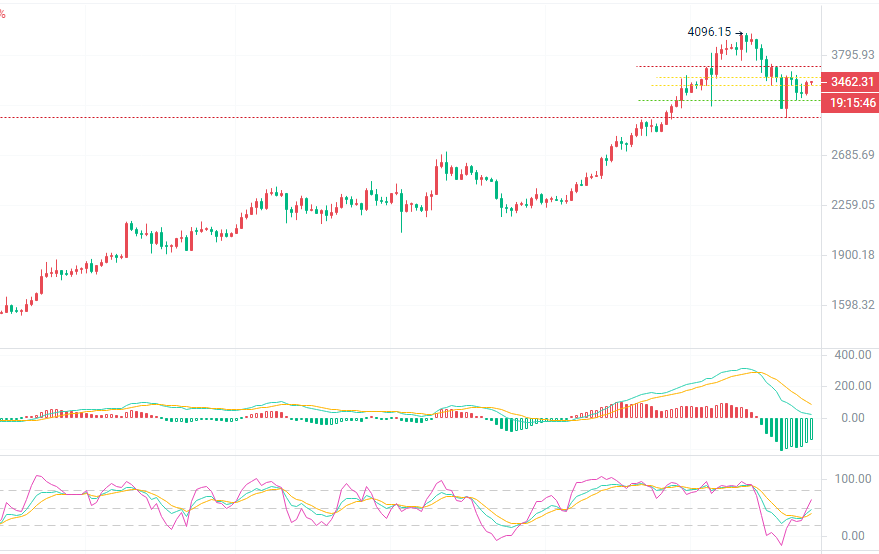 First, let's review the trend of Ethereum yesterday. In yesterday's article, we suggested a reference buying point of 3300 and a target price of 3450, successfully earning a space of 150 points. The current price is 3460, with strong bullish momentum, so risk control is needed. The short position accumulation point we mentioned before is 3520, with a stop-loss point near 3550 to prevent a comprehensive outbreak of the bullish trend. Please operate cautiously and closely monitor market changes.