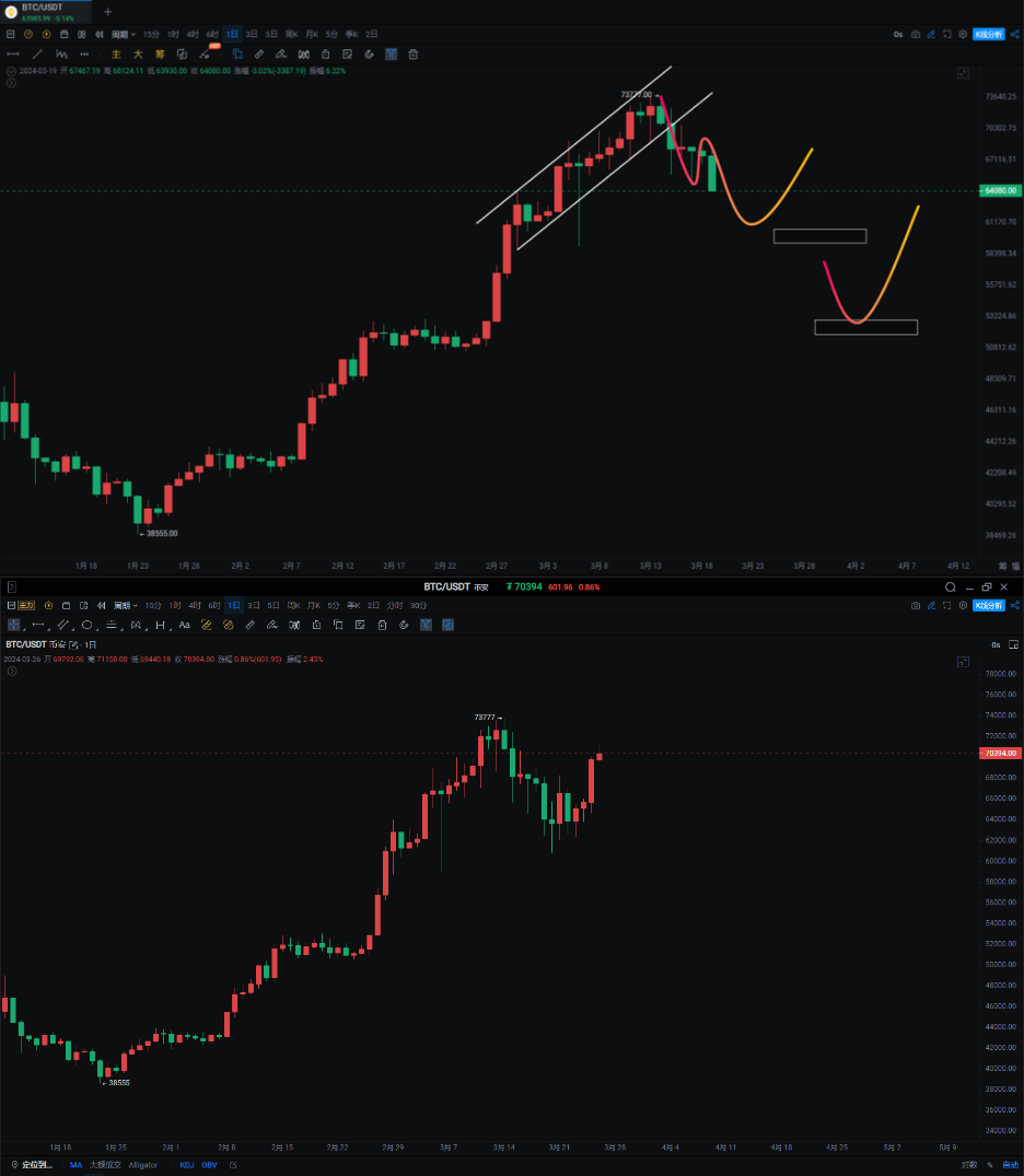 Regarding the pullback: After the previous surge to 73,777, the subsequent pullback did not break below 0.786, indicating a weak pullback. Therefore, we consider this area as the first bottom fishing zone at 59,000 to 60,000, and the second bottom fishing zone at 50,000 to 52,000 (one of the plans is to enter at the extreme points before and after the halving). Previously, we thought that Bitcoin would oscillate in a triangle pattern before breaking through or forming a round arc pattern to reach a new high. Currently, it seems that this possibility may occur on the daily chart first, and then we will observe the time and space.