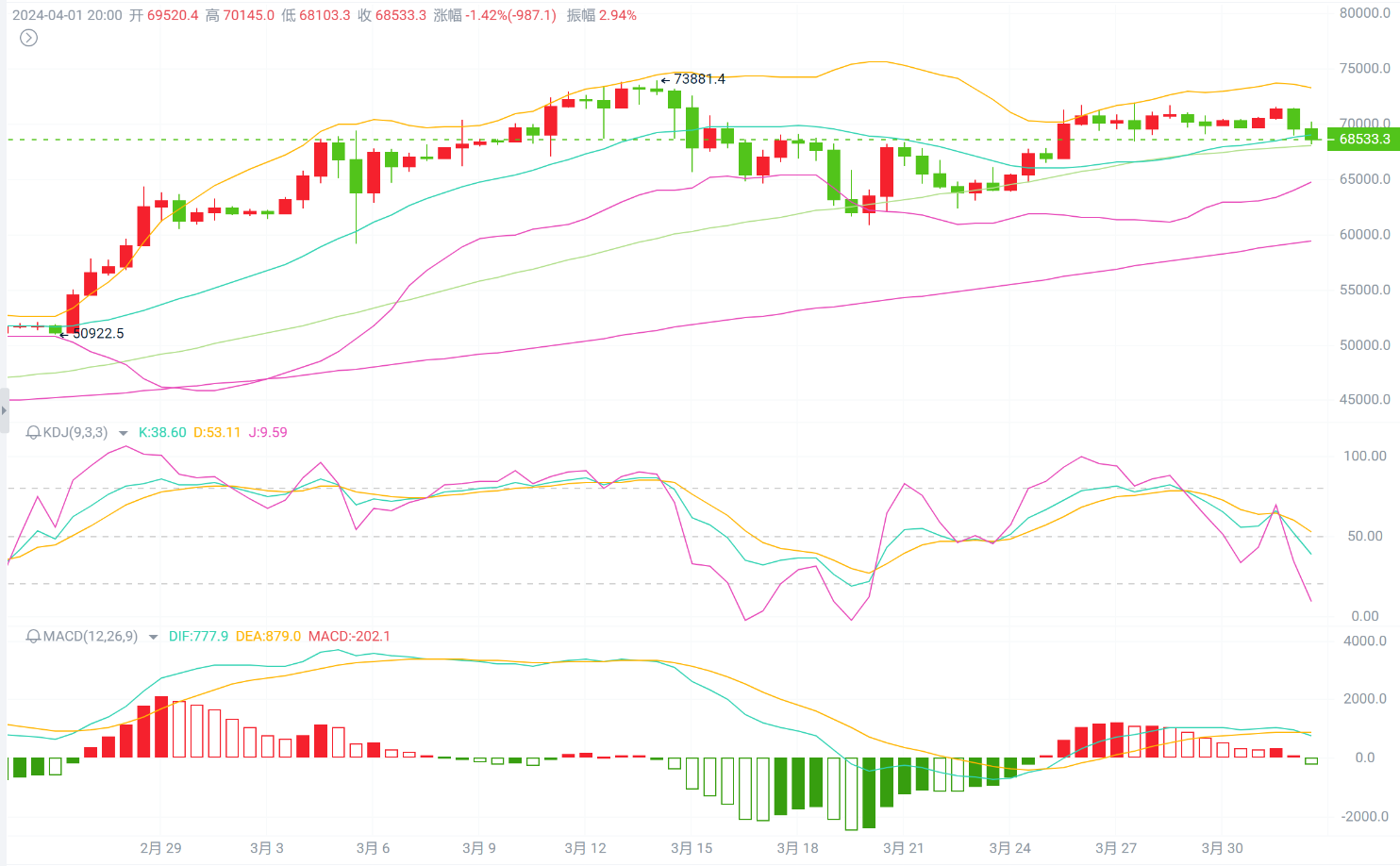 From a technical perspective, the daily KDJ, MACD, and BOLL indicators for Bitcoin/Ethereum are all showing bearish signals. On the 12-hour chart, the KDJ lines are currently weakening, and the coin price has fallen below the middle track of the Bollinger Bands. The MACD is in a short-term oscillation with a slight increase in bearish volume, indicating a dominant bearish trend in the short term. In terms of future operations, we can consider shorting on the rebound. Specific reference points are as follows: