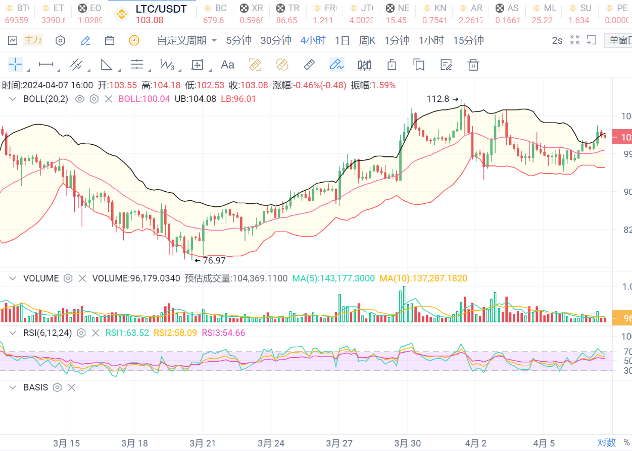 LTC: The price continues to stay above the Bollinger Band midline, with the trend still healthy, support level at 100, and resistance level at 110.